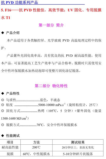F16——抗PVD性能佳,高效節能;UV 固化、專用脫膜水固化、專用脫膜水 T1