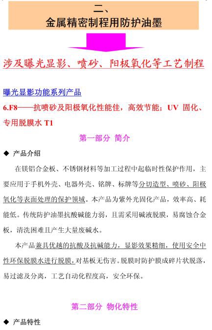 F8——抗噴砂及陽極氧化性能佳,高效節能;UV 固化、專用脫膜水固化、專用脫膜水 T1