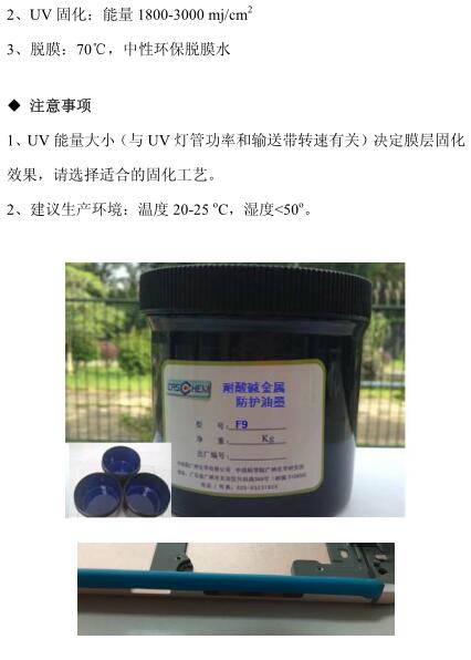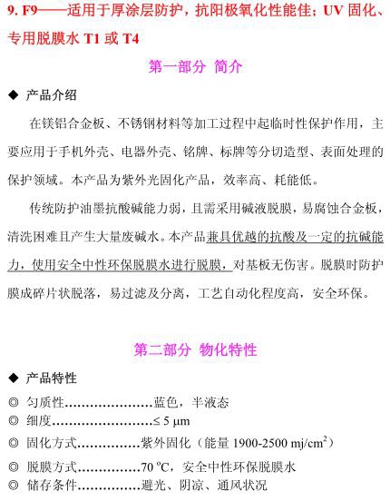 F9——適用于厚涂層防護, 抗陽極氧化性能佳;UV固化、專用脫膜水固化、專用脫膜水T1或T4