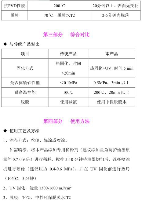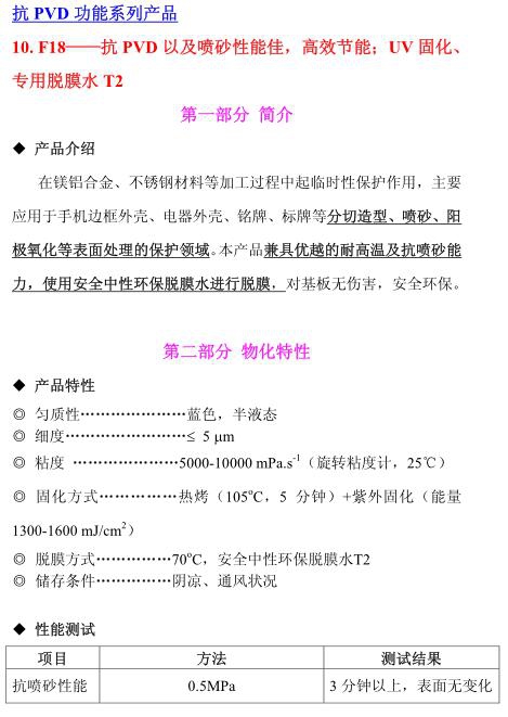 F18——抗PVD以及噴砂性能佳,高效節能;UV固化、專用脫膜水固化、專用脫膜水 T2