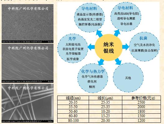 中科院廣州化學有限公司前身為成立于1958年的中國科學院廣州化學研究所,它是中國科學院在華南地區唯一的以應用研究和高技術創新為主的綜合性化學研發機構,也是中國科學院新型特種精細化學品技術與產業化聯盟的盟主單位。主要從事粘膠劑、涂料、化灌材料等環保型高分子材料、電子信息聚合物以及建材添加劑等精細化學品的研發、生產和銷售。公司與加拿大女皇大學合作,擁有納米銀線、導電油墨、導電銀漿和透明導電薄膜等材料的研發和生產,可以提供多種級別的納米銀線分散液等產品,銀納米線可選直徑有20-35nm35-50nm50-60nm60-80nm80-100nm等,銀納米線長度可以根據客戶要求定制,溶劑可選去離子水、無水乙醇、異丙醇或客戶指定,濃度可為5mg/ml10mg/ml20mg/ml或客戶指定。一般供貨時間兩天以內,量多的話供貨時間待商榷。