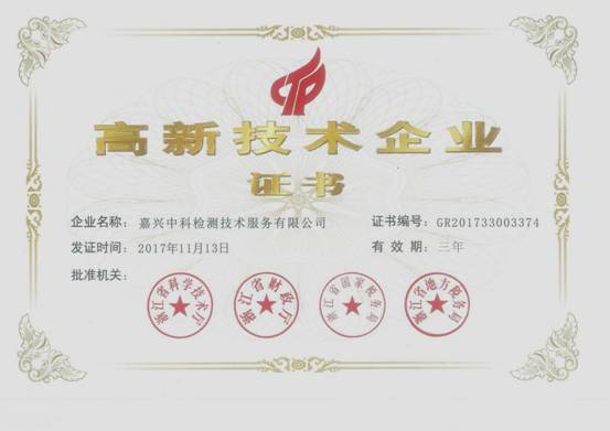 嘉興中科檢測自成立以來,嚴格按照國家《高新技術企業認定管理辦法》和《高新技術企業認定管理工作指引》的相關要求,不斷提升自身的研發技術實力,壯大研發及技術團隊,不斷加強創新能力建設、強化企業的科學管理,于2017年底順利通過高新技術企業資格評審。