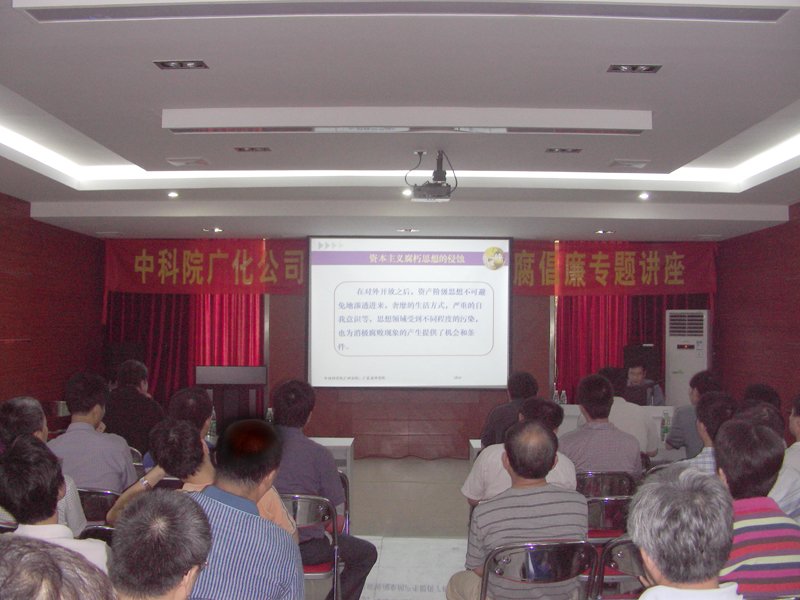 為進一步加強黨風廉政建設,增強干部職工廉潔自律意識和拒腐防變能力,7月21日,公司邀請中國科學院廣州分院、廣東省科學院黨組副書記、紀檢組長許魁文同志來公司作“加強黨風廉政建設,提高拒腐防變意識”專題報告。