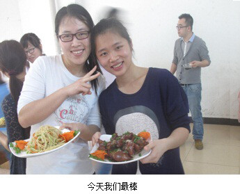 研究生會副主席王璐一聲令下,“廚藝達人秀”拉開帷幕,廚藝包括規定菜和特色菜的比拼。規定菜是清炒土豆絲,簡單的菜肴形象地考察了選手們的基本功,雖然選手們刀工并不十分精湛,但對味道的良好掌握還是為每組參賽選手贏得了客觀的分數;真正令人嘆為觀止的還是特色菜的比拼,在規定時間內,各小組都捧出了精心制作的菜肴。選手們選用最常見的菜式做出了不一樣的風味,清蒸鱸魚、土豆肉片、芒果椰汁西米露、紅燒豬蹄、辣炒花蛤,無論是外觀還是味道,都令在場觀眾和評委贊嘆不絕。最后,評委們根據成品菜的色、香、味、火候等方面對參賽作品進行了打分。