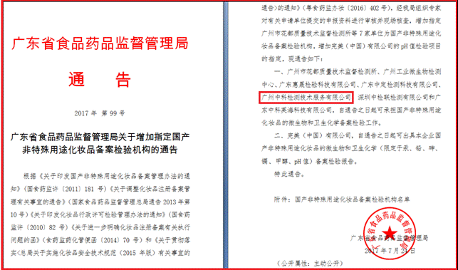 7月24日,中科院廣州化學(xué)有限公司(廣州化學(xué))全資子公司-廣州中科檢測(cè)技術(shù)服務(wù)有限公司(中科檢測(cè))獲得廣東省食品藥品監(jiān)督管理局頒發(fā)的國(guó)產(chǎn)非特殊用途化妝品備案檢測(cè)機(jī)構(gòu)資質(zhì)。