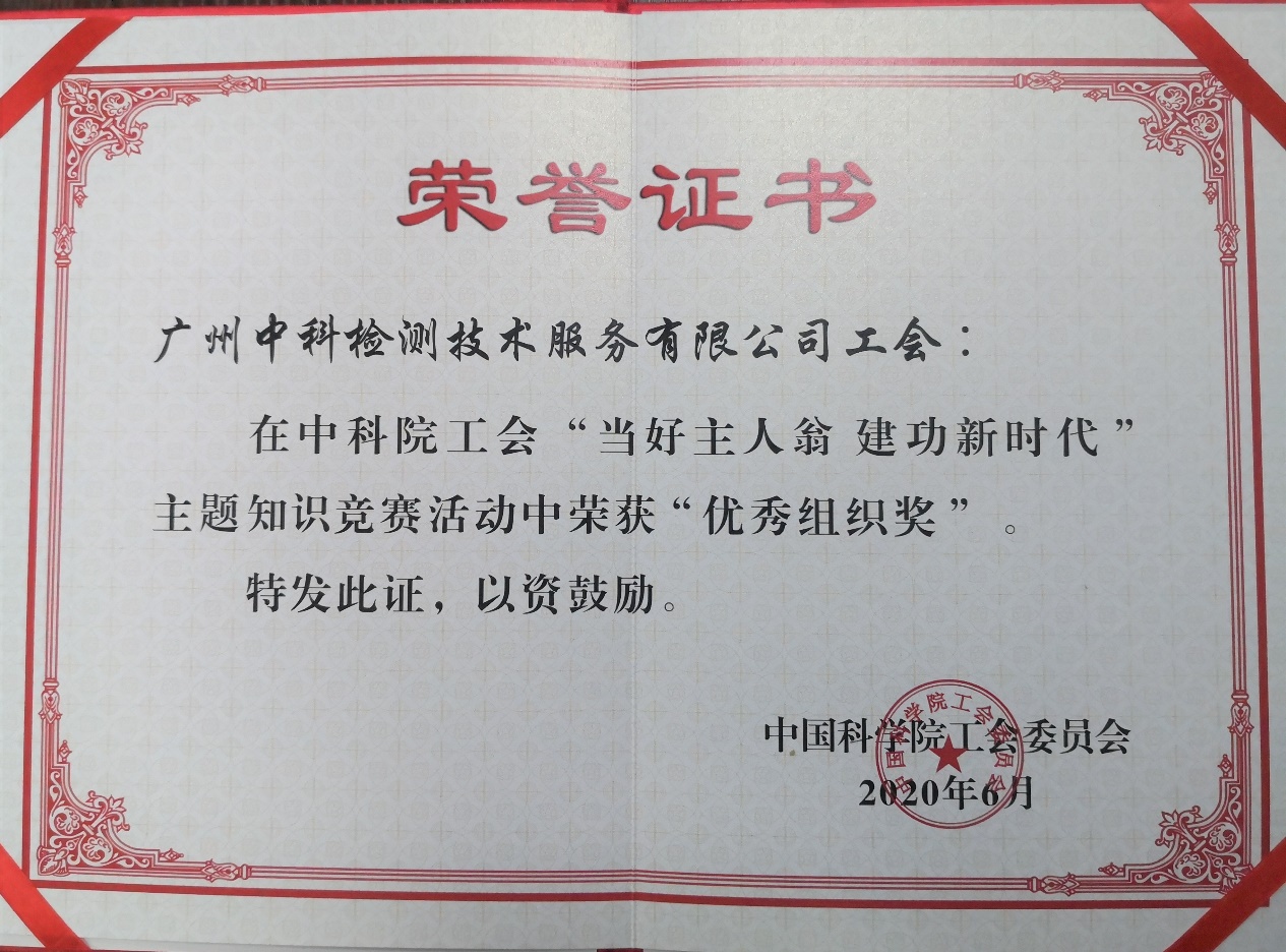近日,中科院廣州化學(xué)有限公司控股公司-廣州中科檢測技術(shù)服務(wù)有限公司工會(中科檢測工會)在中國科學(xué)院工會委員會(中科院工會)舉辦的“當(dāng)好主人翁 建功新時(shí)代”主題知識競賽活動(dòng)(活動(dòng))中榮獲“優(yōu)秀組織獎(jiǎng)”。